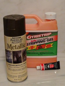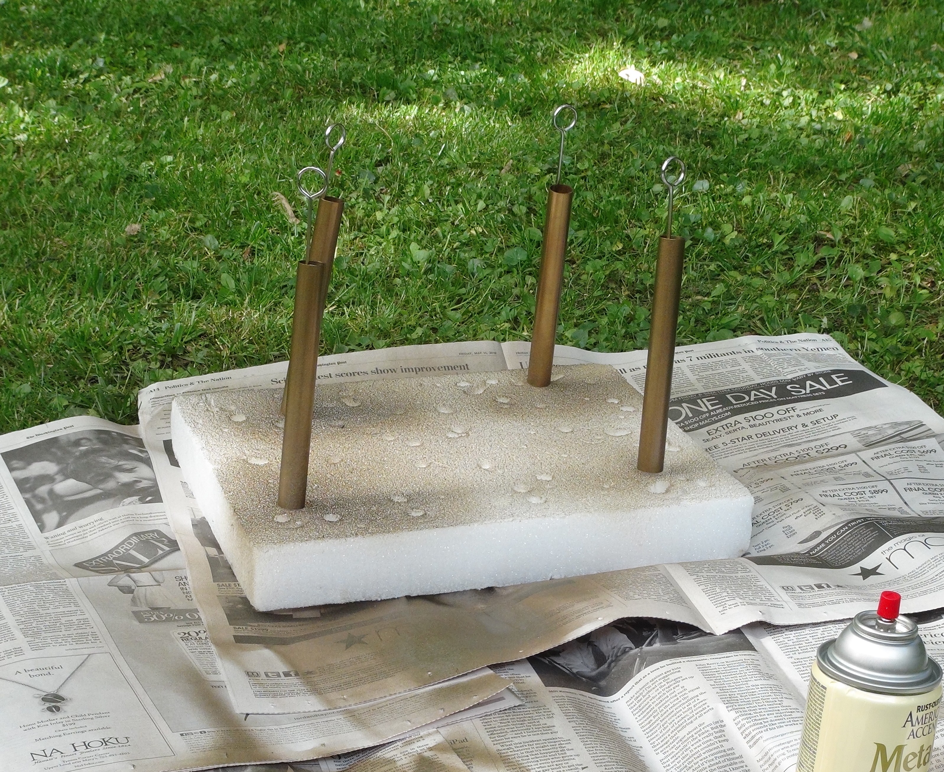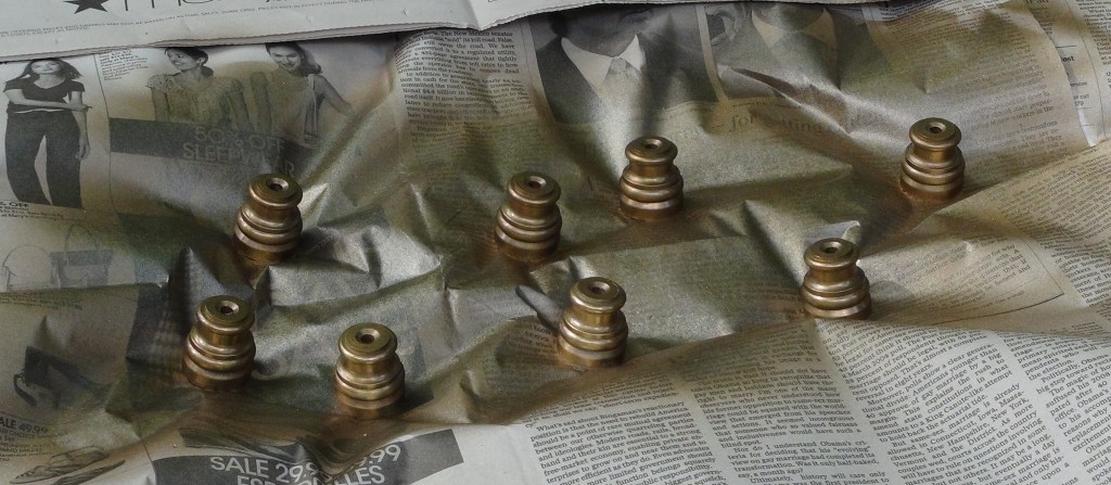 I liked the bronzed pineapple finials, so I decided to tone down the brass fittings. They screwed off easily and I sprayed them with American Accents Classic Bronze. To get an aged look, I rubbed a tiny bit of ebony Rub ‘n Buff over them. It’s important not to cover the whole fitting with the ebony–just apply a few streaks sparingly. Using styrofoam and skewers made this process a cinch.