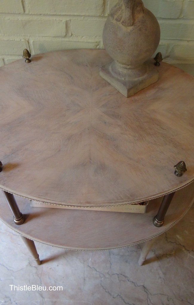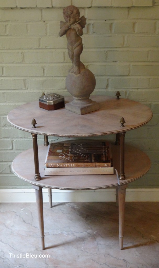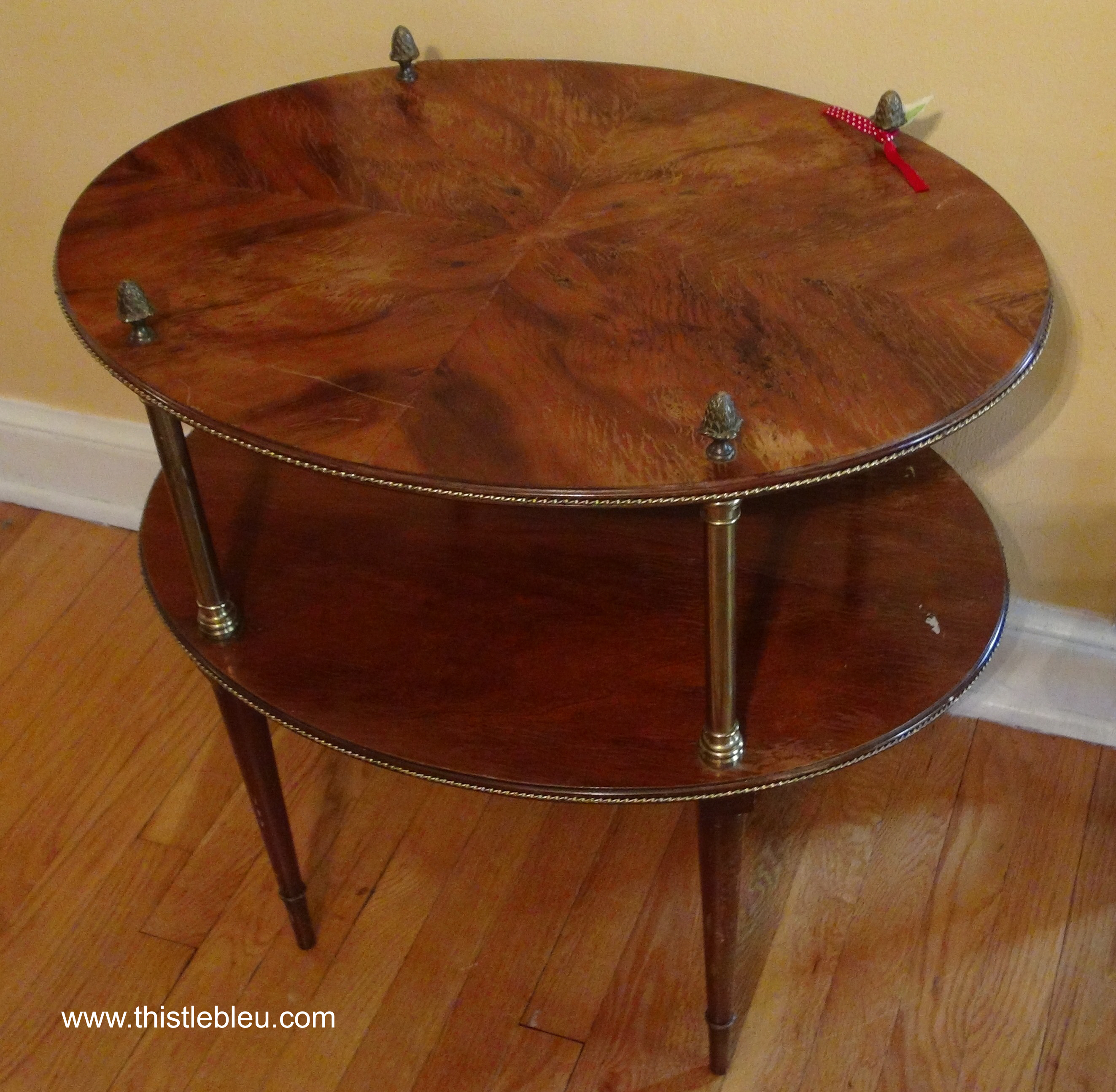 I found this tiered stand looking a bit forlorn at a thrift store. He had great lines, maybe something you would find in a Paris apartment with those narrow tapered legs, brass fittings, and marquetry finish.