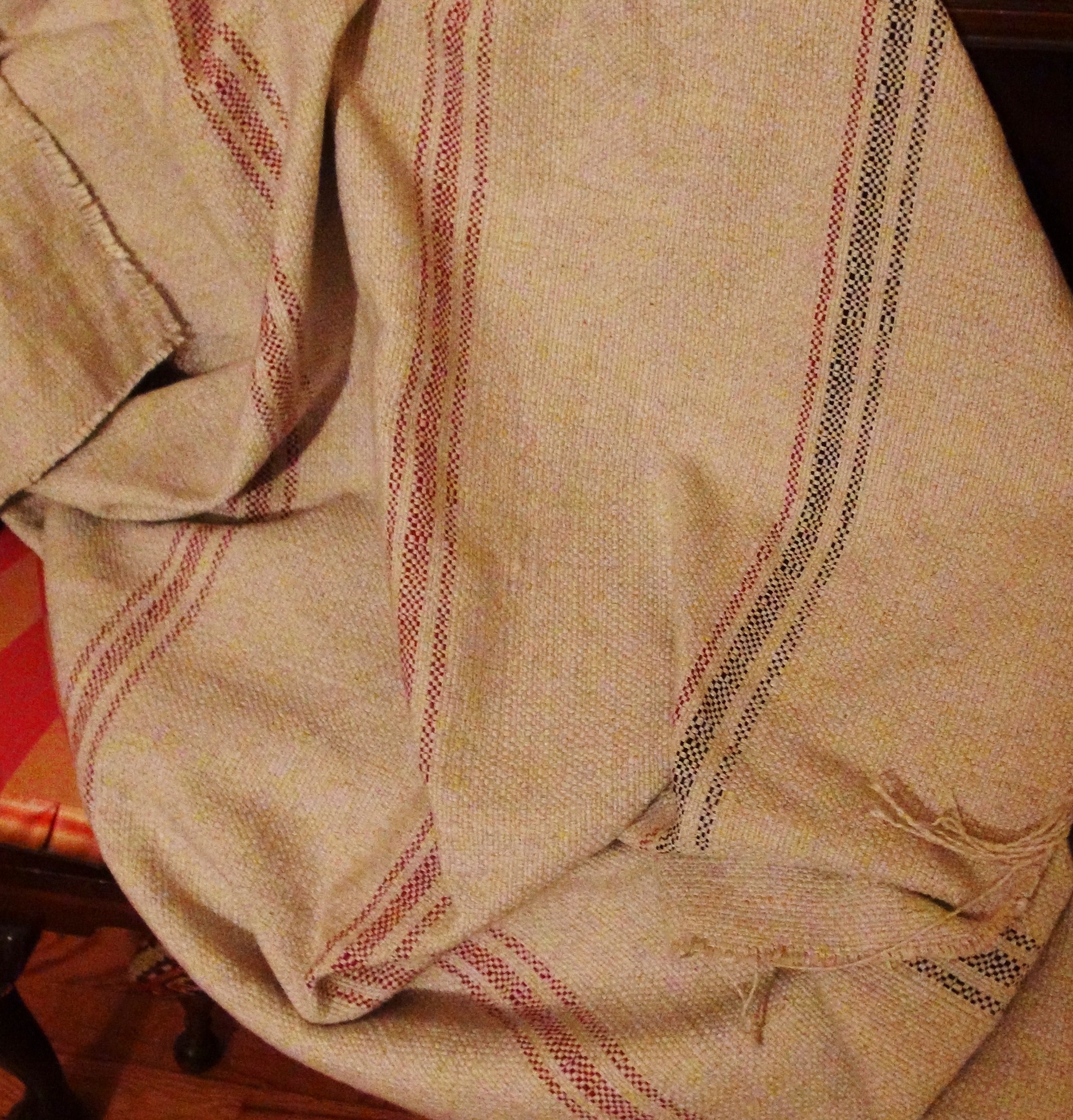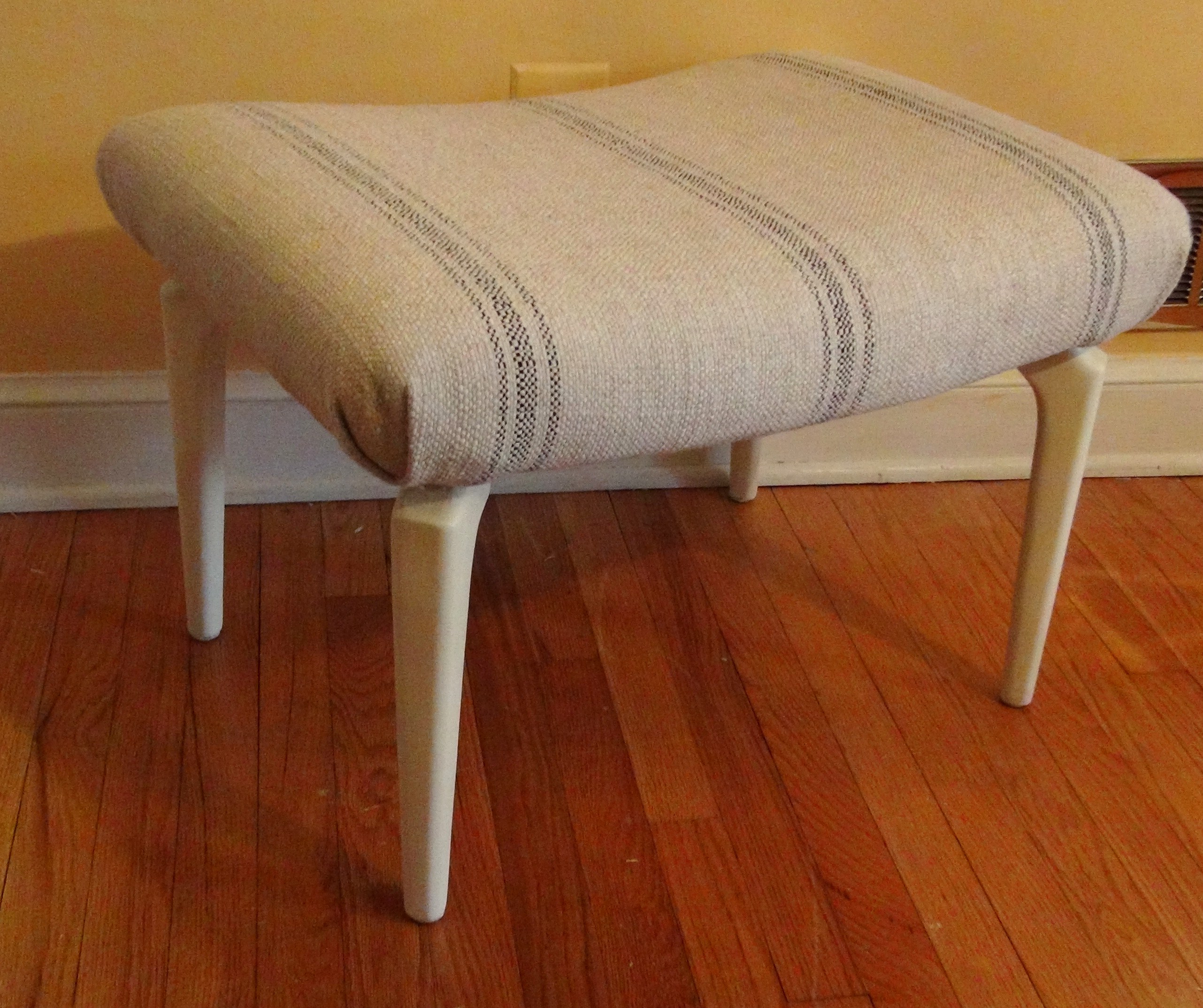 I reupholstered the ottoman with this linen fabric resembling a French grain sack but it was a much heavier upholstery weight.