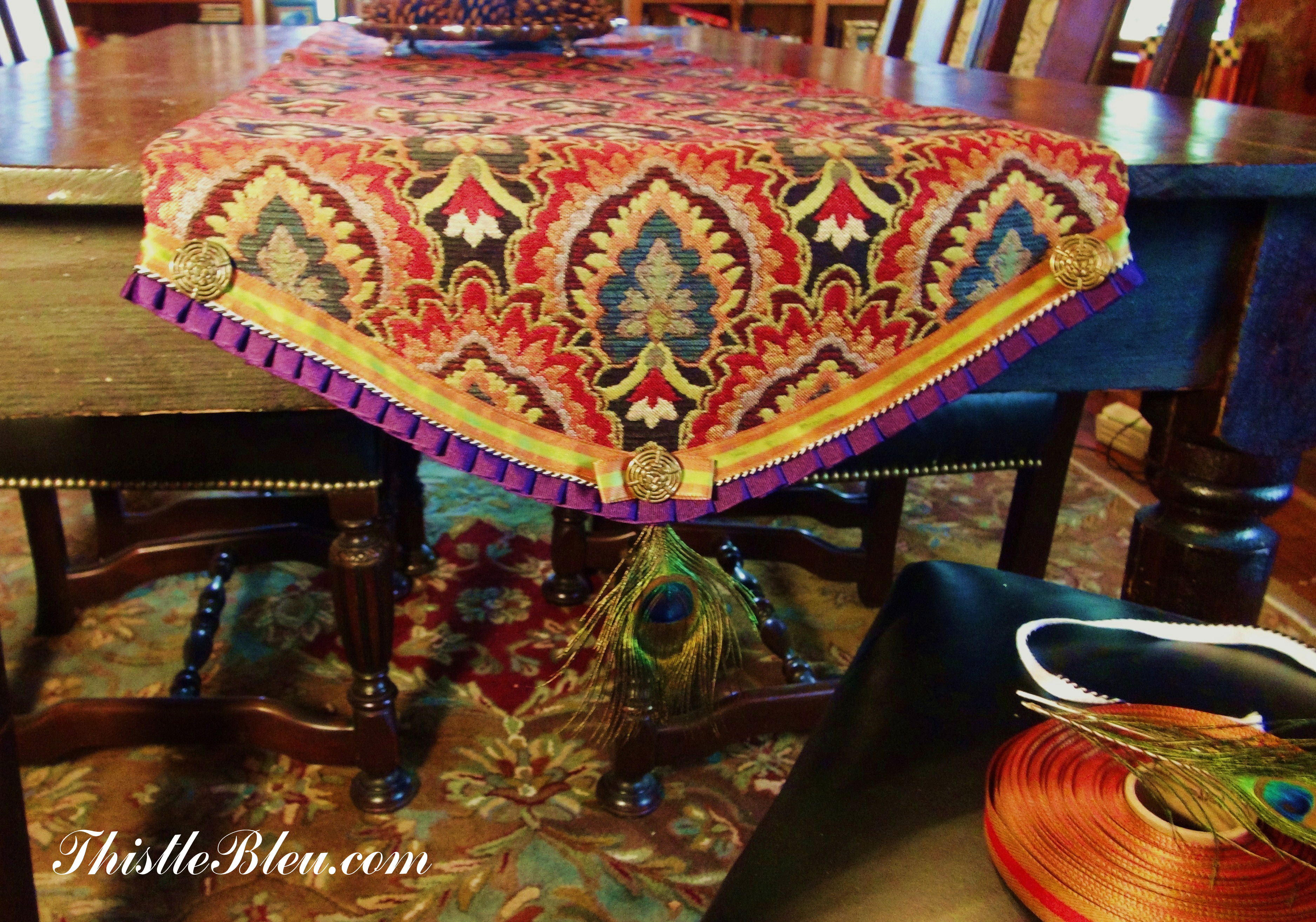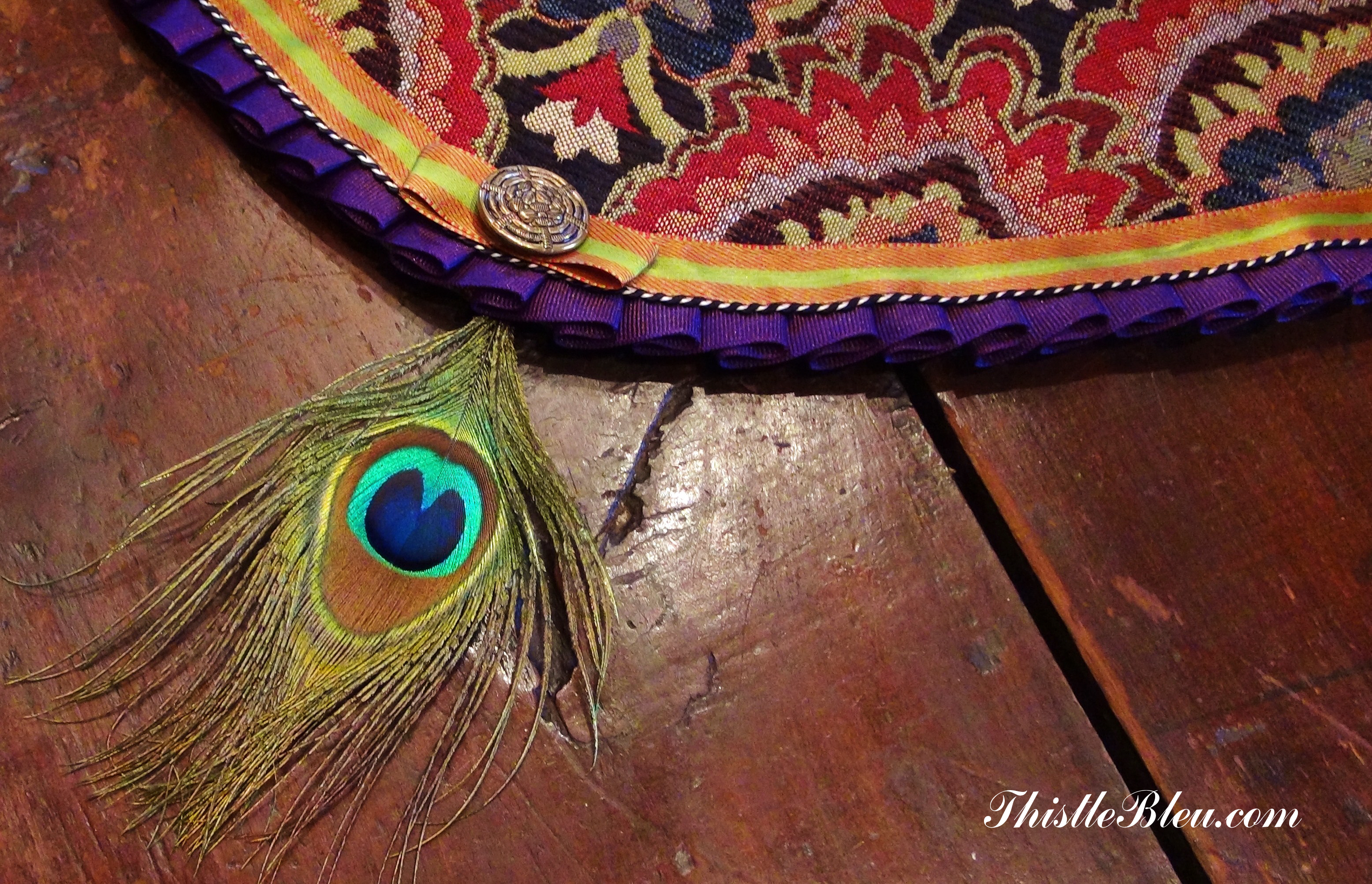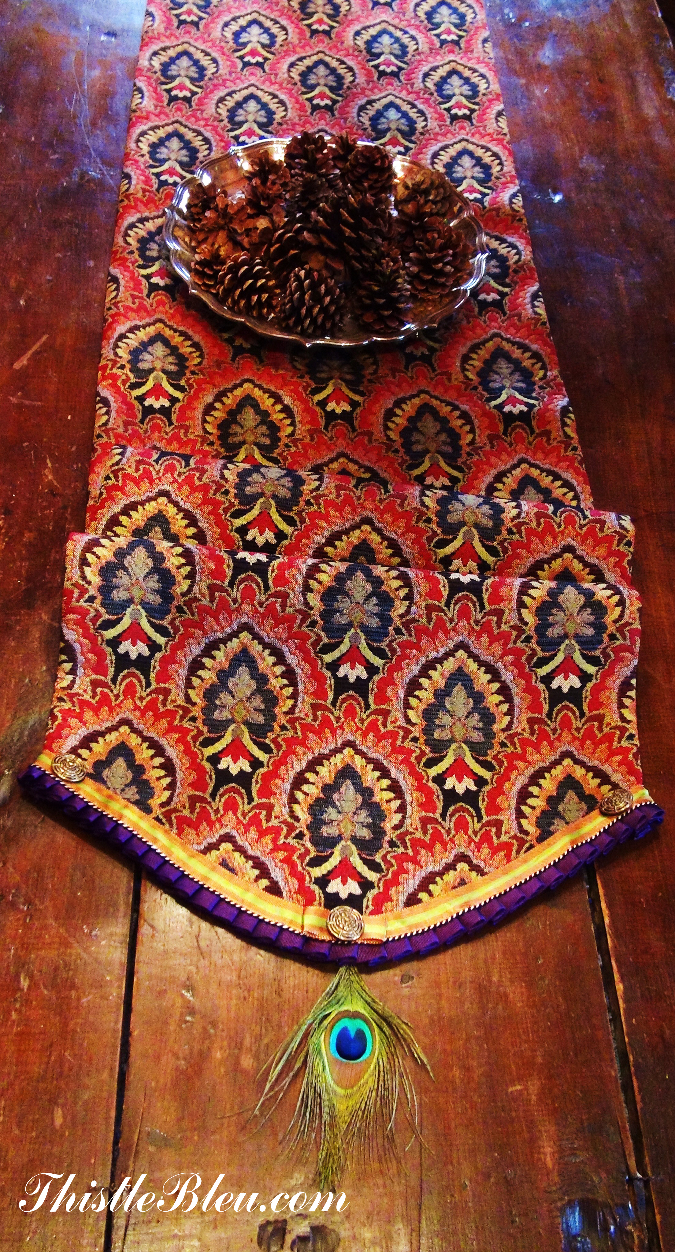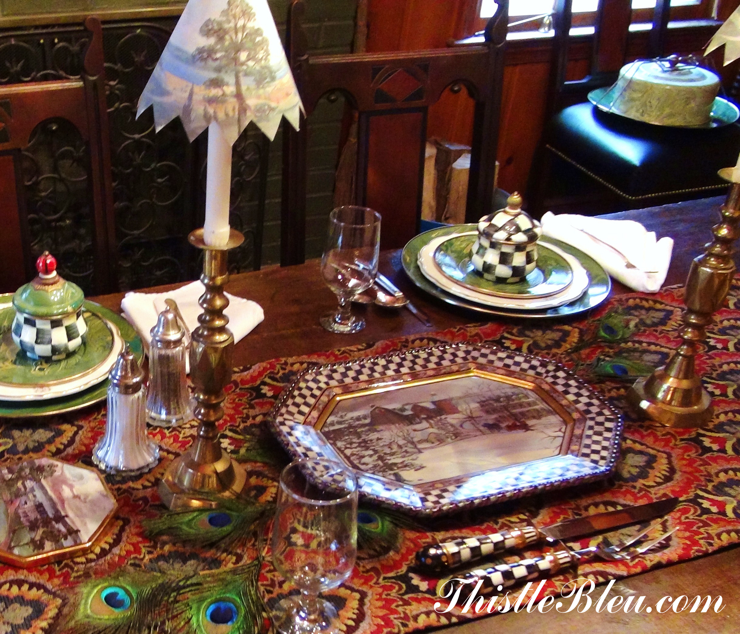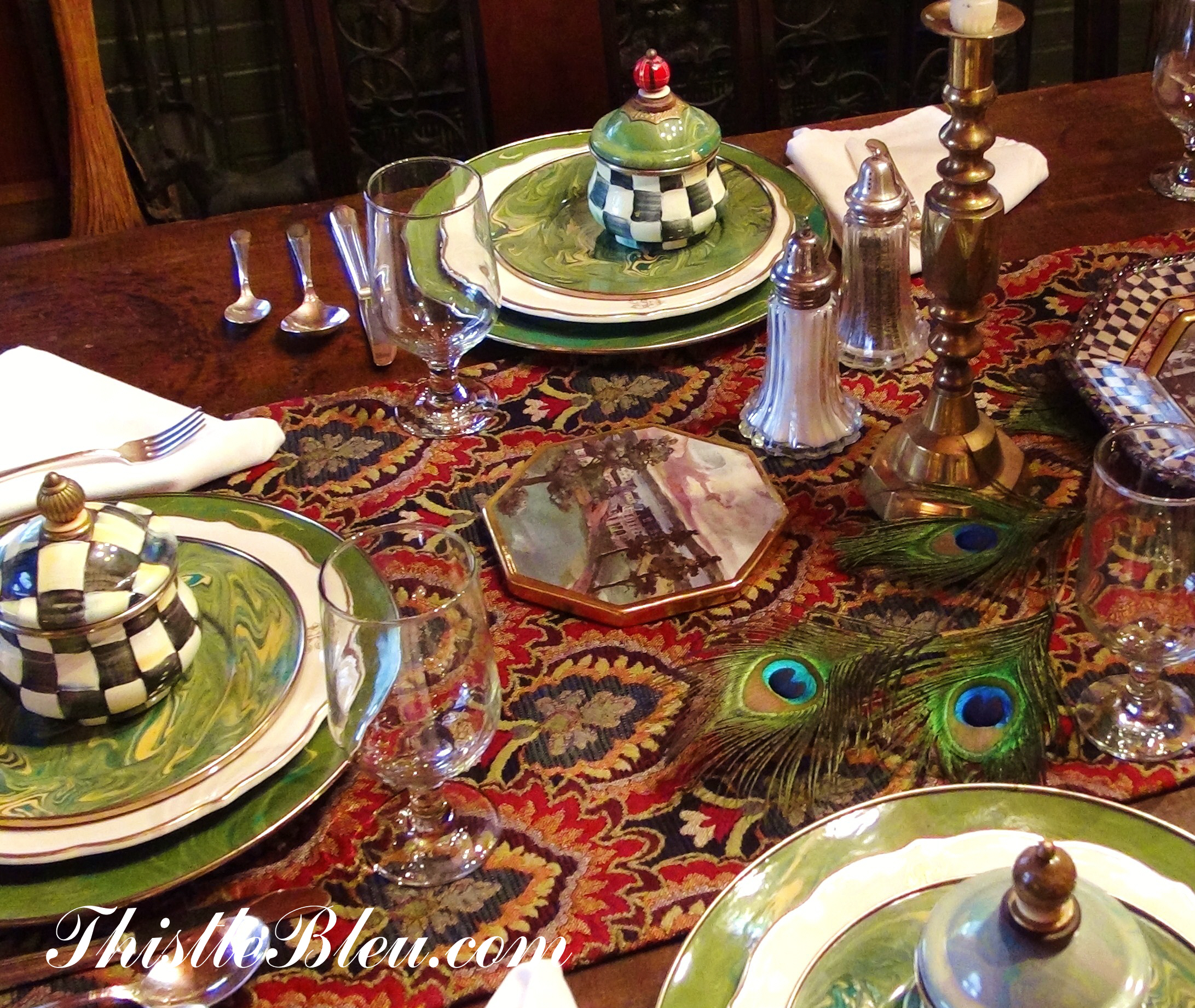 You really can’t go wrong with peacock feathers……the perfect embellishment for a Mackenzie Child’s inspired table runner. Back in the day when visiting the original  Mackenzie Child’s there were always peacocks strutting around the grounds amid the pom pom headed chickens.