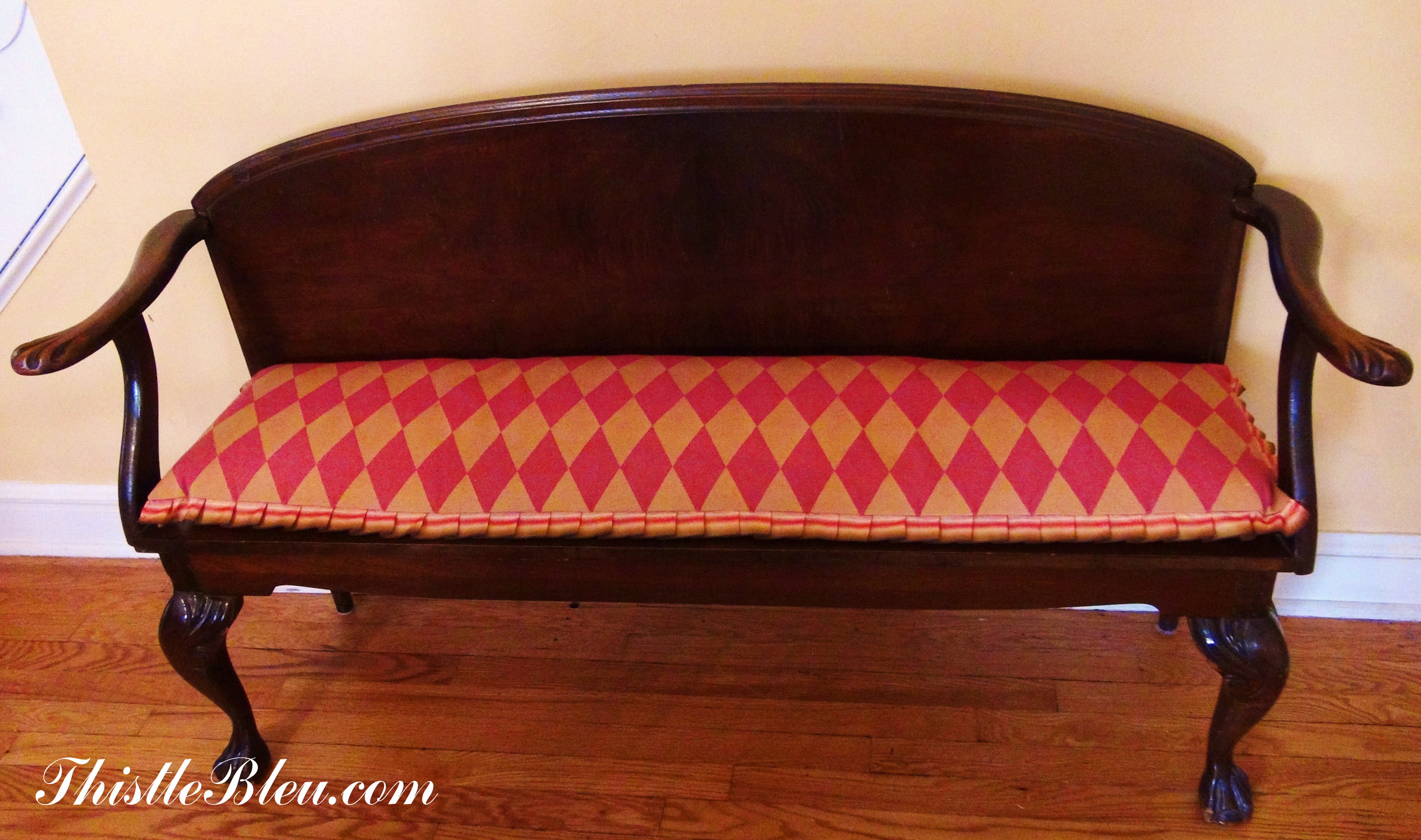 I found this gem at a thrift store. It had great lines so I thought I would someday give it a go. I stored it outside in a shed for a year fearing that bed bugs had taken up residence in it. I replaced the foam and batting before recovering it.