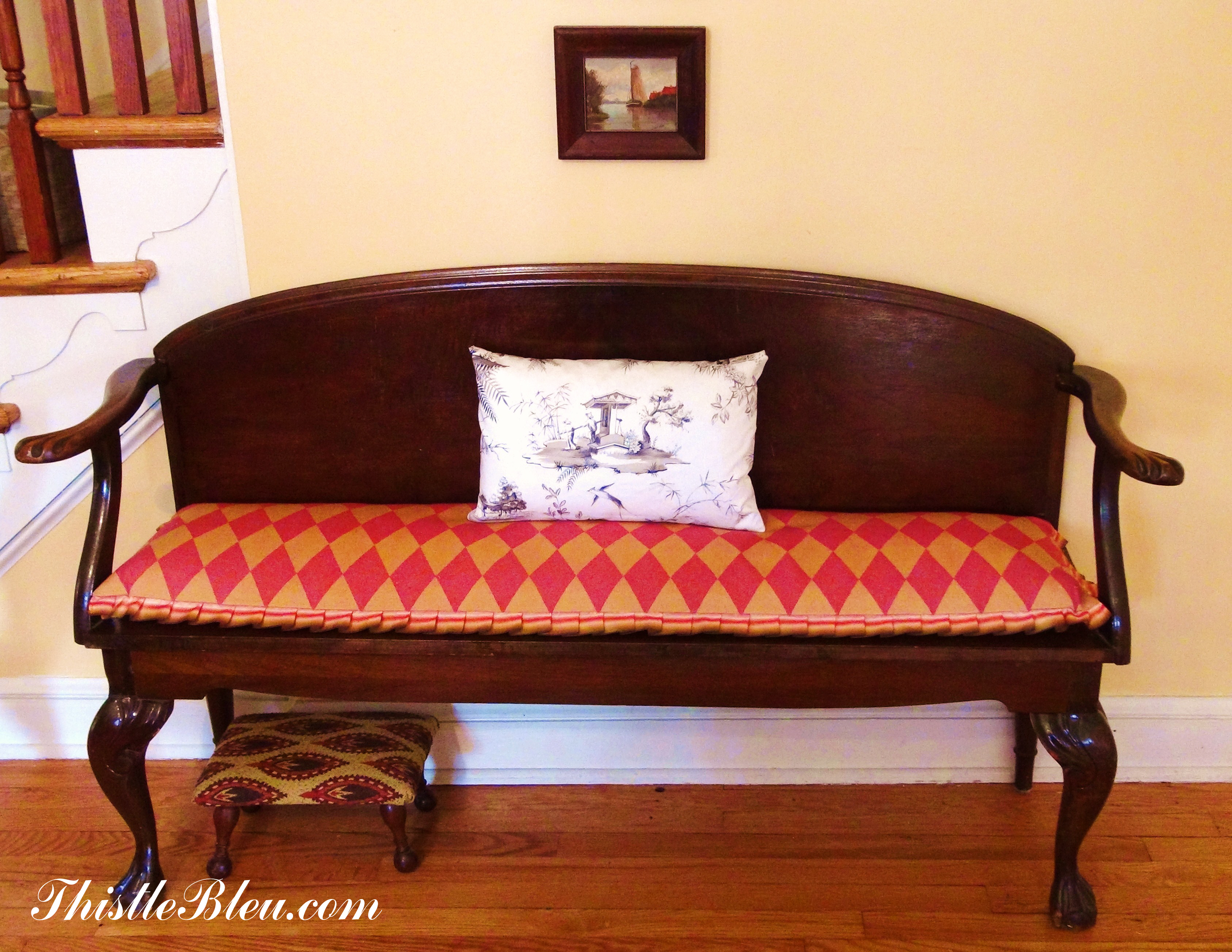 The ribbon really was the jewelry that set this grain sack upholstery apart from that catalog look. This was a Christmas gift for my niece.