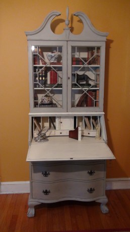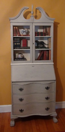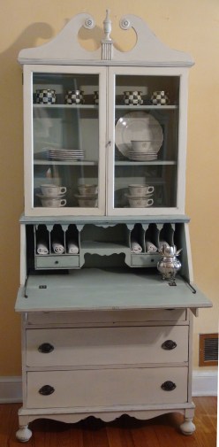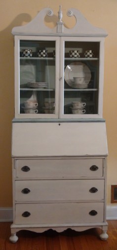 I purchased the French Linen Secretary – and it is a wonderful, special edition to my home! I love it. The paint color on the piece is perfect. We love the small compartments in the secretary. I’m also so happy that the lower drawers move in and out with no difficulty. My husband who dislikes most shabby chic items I buy, is very pleased with the piece. It was easy to haul in my mini van. Lynette was kind enough to include the original owners “fish club” card from the YMCA indicating he passed his swim test. I’ve seen the Old White Secretary and it was a challenge to pick between the two, as it is also a lovely piece. I hope Lynette continues to post items for purchase!